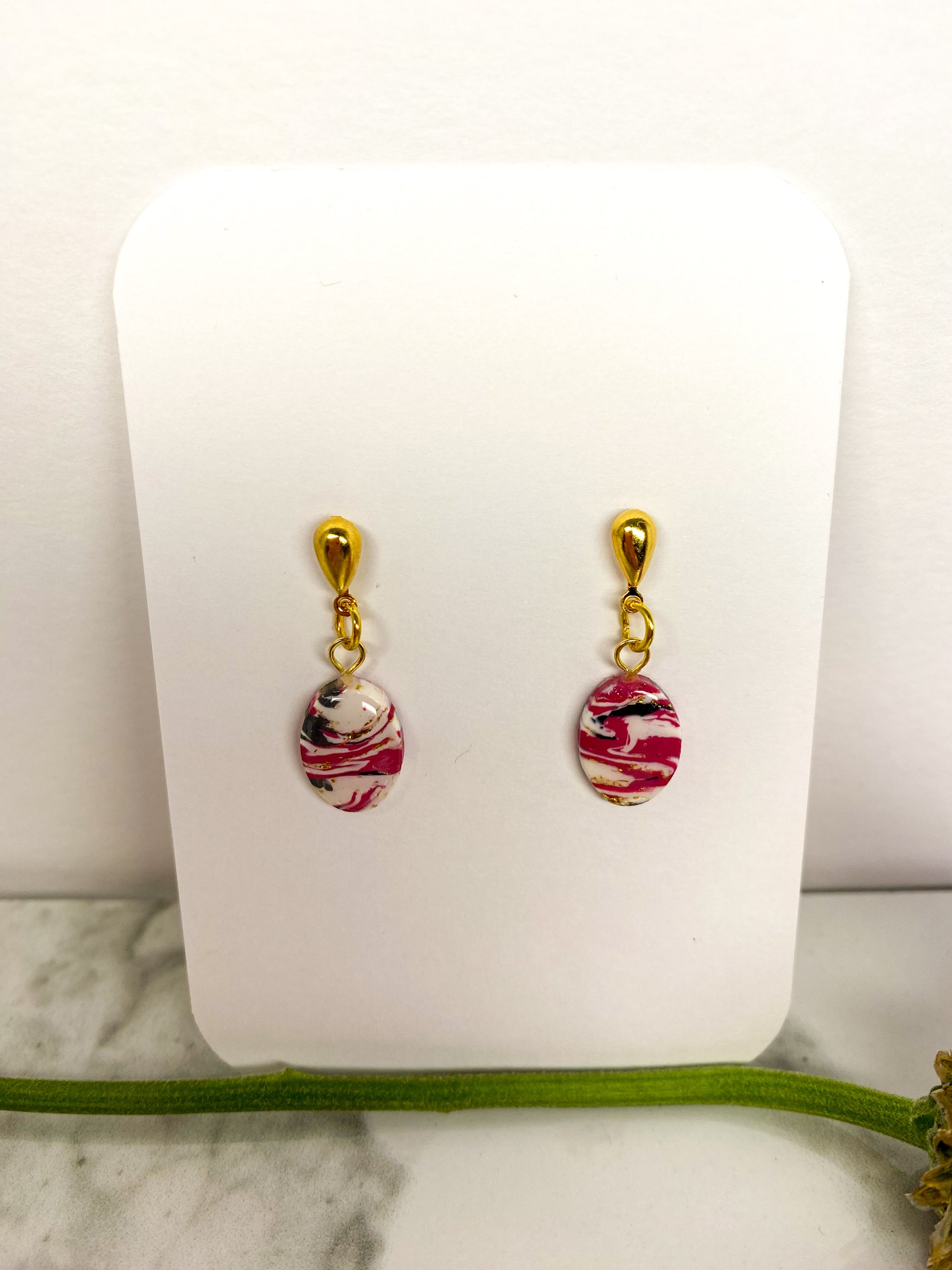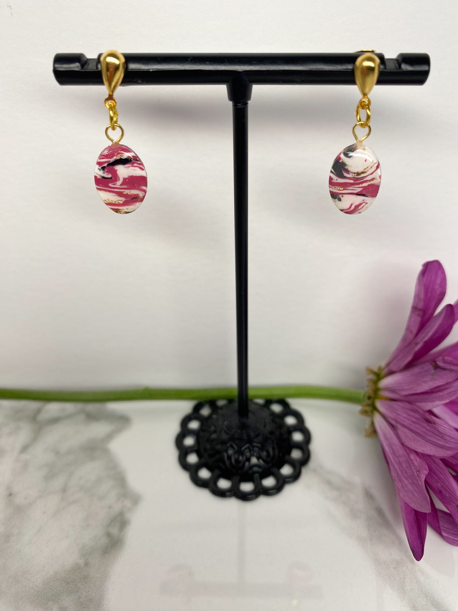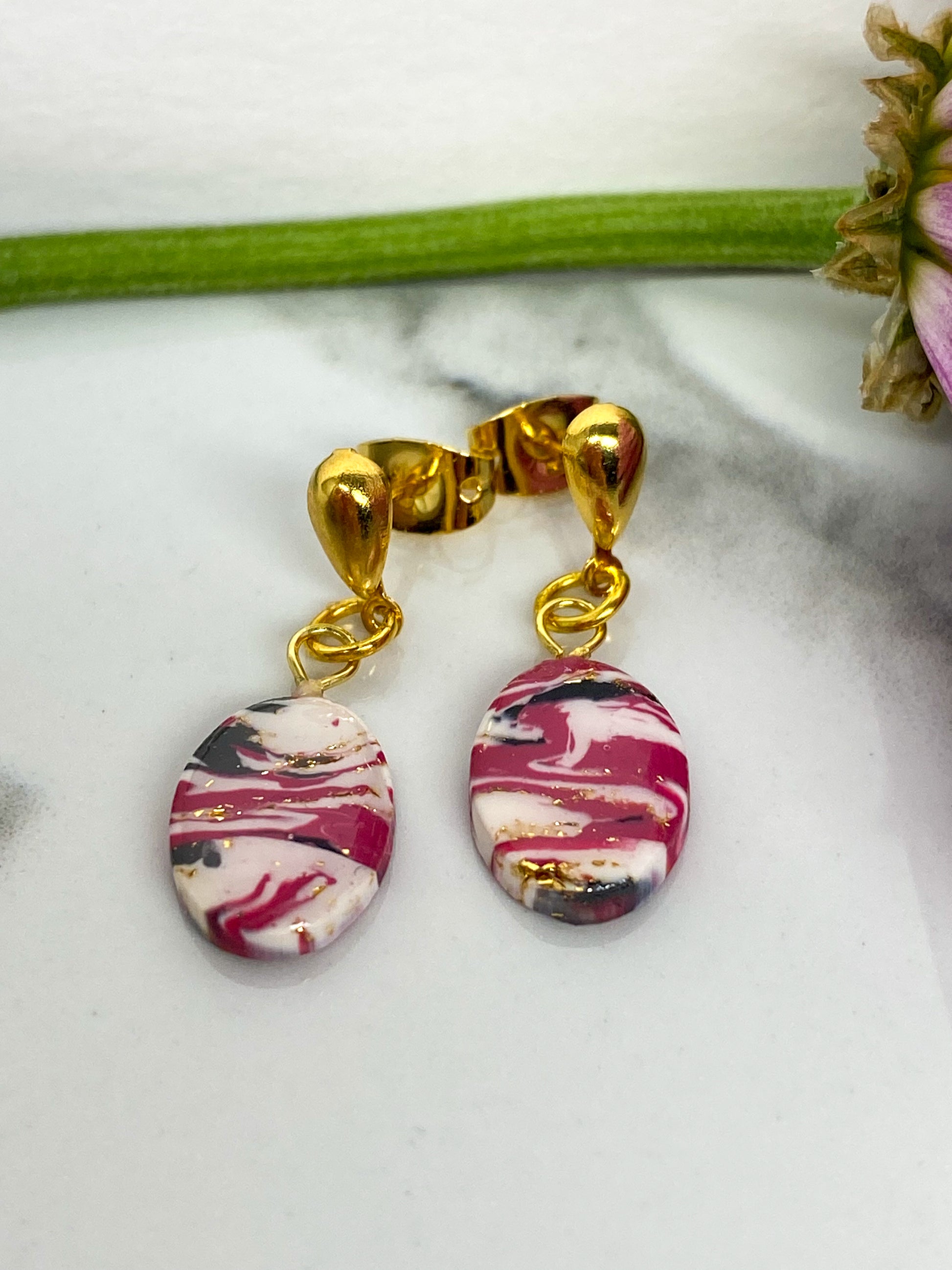 Polymer clay, gold foil, and resin. Gold plated stainless steel brass findings and jump rings. Pattern will vary due to cane style.